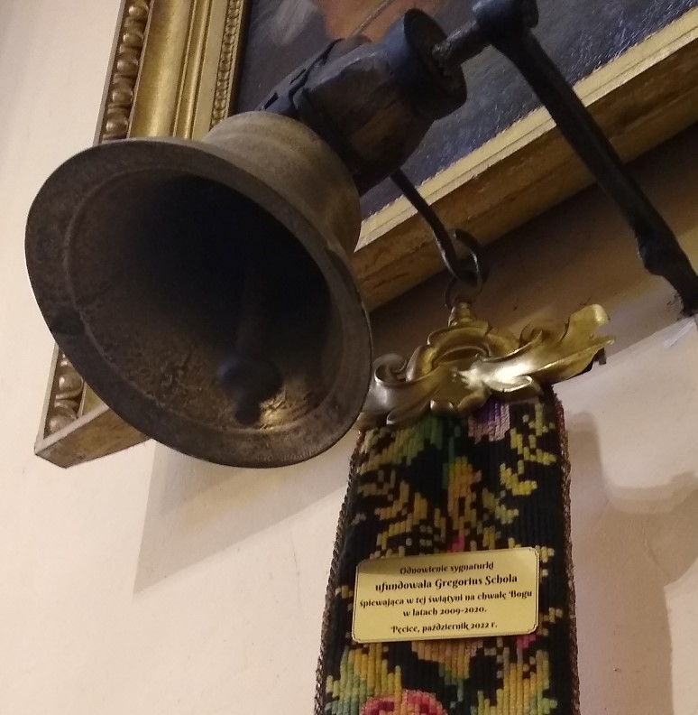 Przy drzwiach do zakrystii zawisła odnowiona sygnaturka której renowację ufundowała Schola "Gregorius" śpiewająca w Parafii Pęcice do 2020 roku.