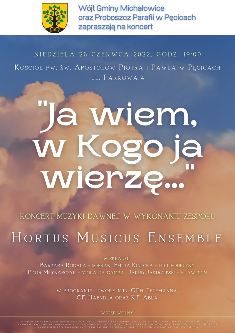 W niedzielę 26 czerwca o godzinie 19:00 odbędzie się koncert muzyki dawnej w wykonaniu zespołu Hortus Musicus Ensemble, pod patronatem Wójta Gminy Michałowice i Proboszcza Parafii Pęcice, wstęp wolny.