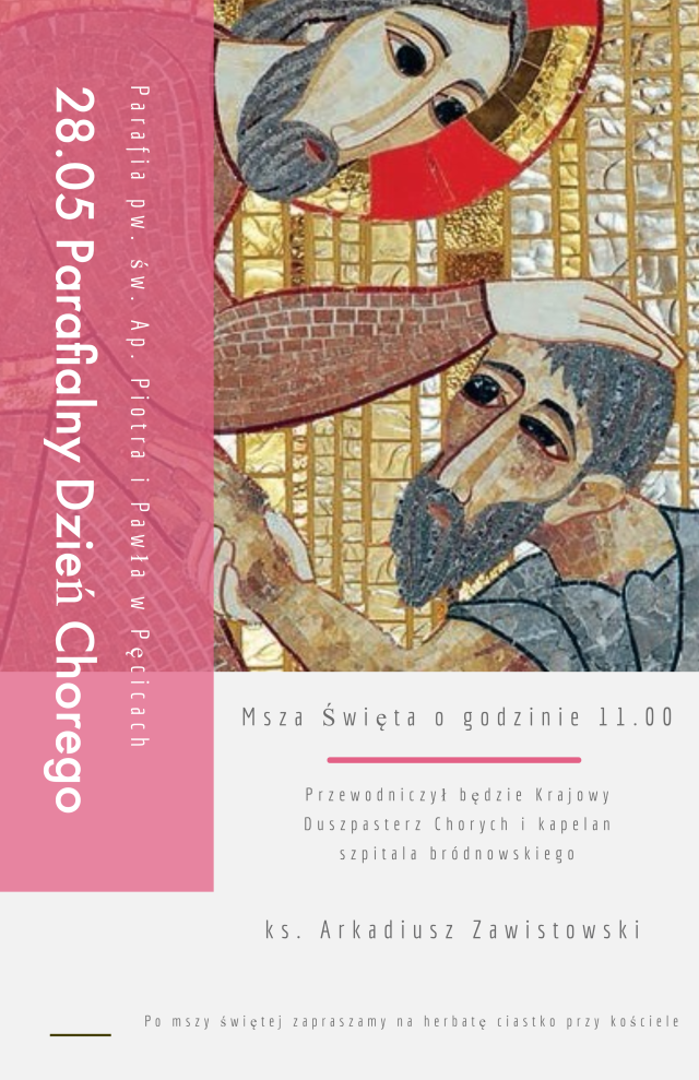 W najbliższą sobotę 28.05.2022 odbędzie się Parafialny Dzień Chorych z uroczystą msza świętą o godzinie 11:00 podczas której udzielany będzie sakrament namaszczenia chorych